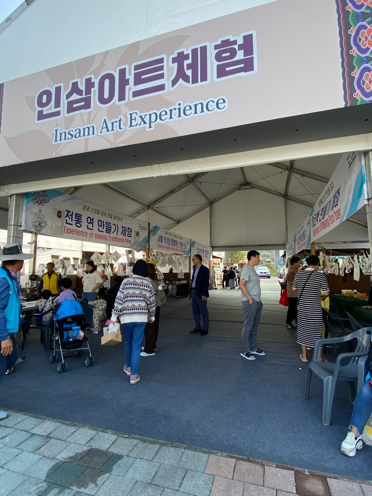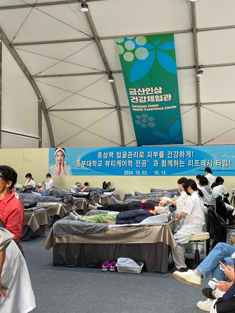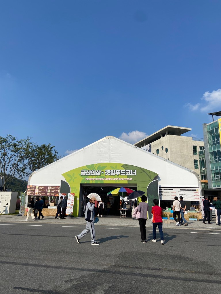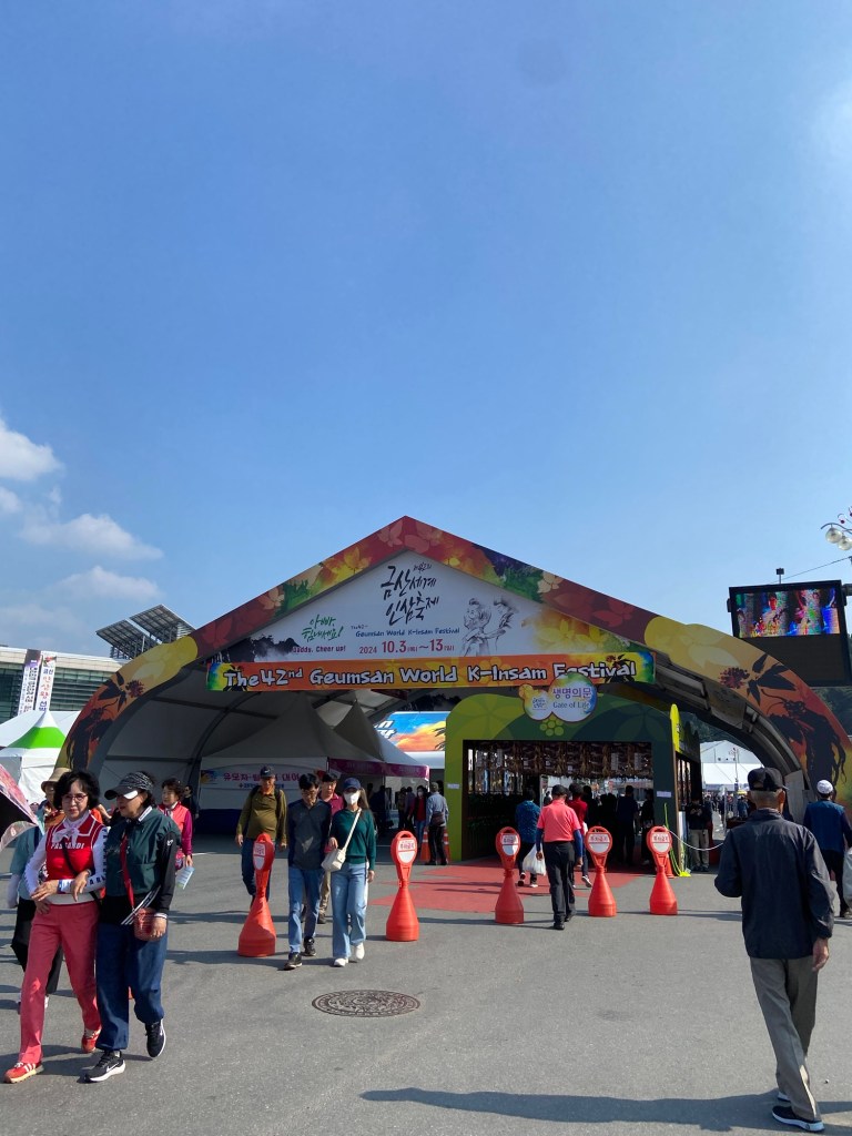 因為選擇乘搭快速車的關係,兩個半小時就到達錦山車站,轉搭的士五分鐘後來到人參節會場。甫落的士當刻,連空氣都充滿了人參氣味,配合韓國阿珠媽最喜歡的舞蹈音樂,祭典氣氛非常高漲!未入會場周圍已有大量人參相關店鋪或攤位,令人目不暇給😀