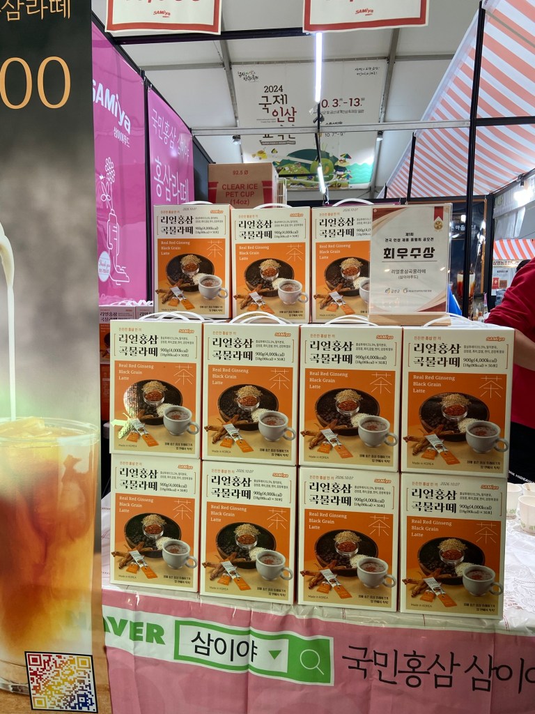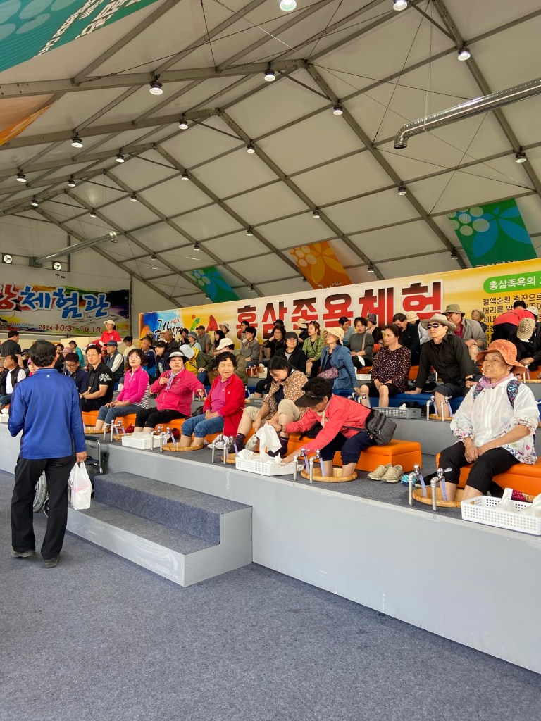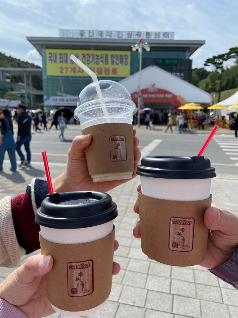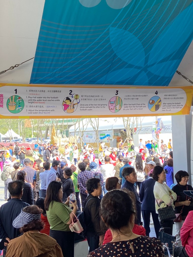 挖完人參,完成是次行程最重要 (!) 的任務後,就乘車回到人參節會場,繼續參加體驗。我們先去買杯人參 latte, 準備排隊嘗試人參足浴。